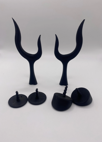 Comes with 2 bases, flat and wedge. The wedge base allows the antlers to stand straight up, while the flat base will sit more to the side. Screws together, can be fed through the wig mesh without use of glue. Stays secure and can be removed if you want to reuse your wig!